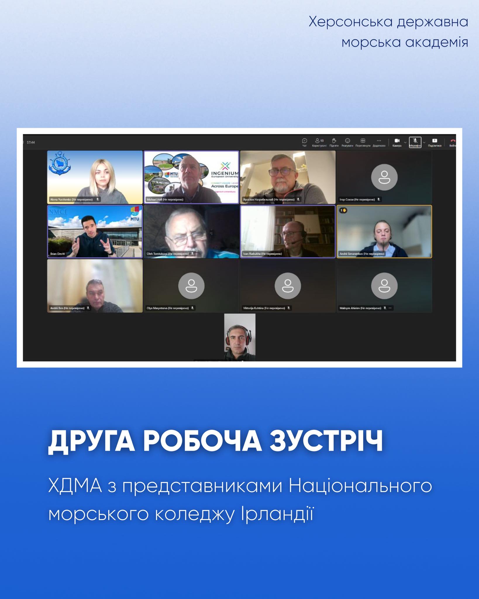7 листопада 2025 року відбулася друга робоча зустріч Херсонської державної морської академії з представниками Національного морського коледжу Ірландії (м. Ringaskiddy, Республіка Ірландія).Зустріч модерував Michael Hall, старший викладач та координатор з питань партнерства INGENIUM Технологічного університету Мюнстер.Під час обговорення сторони зосередилися на перспективах співпраці — зокрема, короткострокових академічних мобільностях здобувачів вищої освіти, а також проведенні спільних наукових досліджень.ХДМА впевнено розширює міжнародні зв’язки та створює нові можливості для своїх студентів і науковців. Попереду — плідна співпраця з ірландськими колегами!