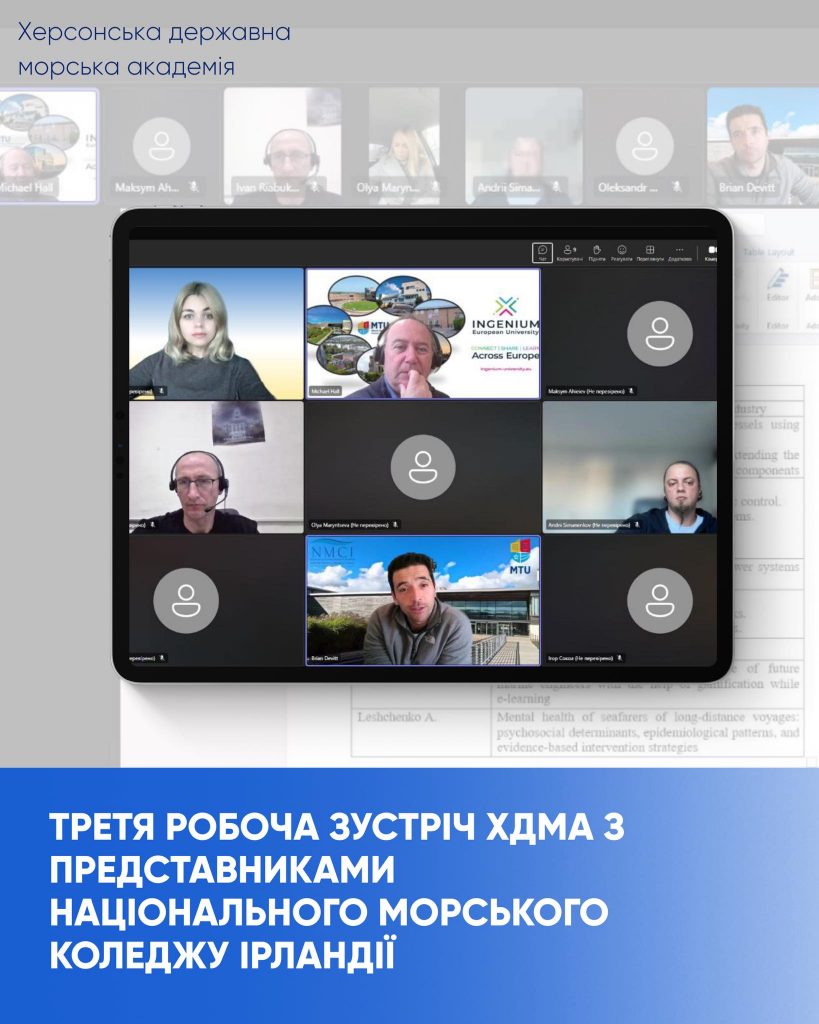 Сьогодні, 21 листопада 2025 року, відбулася третя робоча зустріч ХДМА з представниками Національного морського коледжу Ірландії (м. Ringaskiddy, Республіка Ірландія). Зустріч модерував Michael Hall, старший викладач та координатор з питань партнерства INGENIUM технологічного університету Мюнстер.