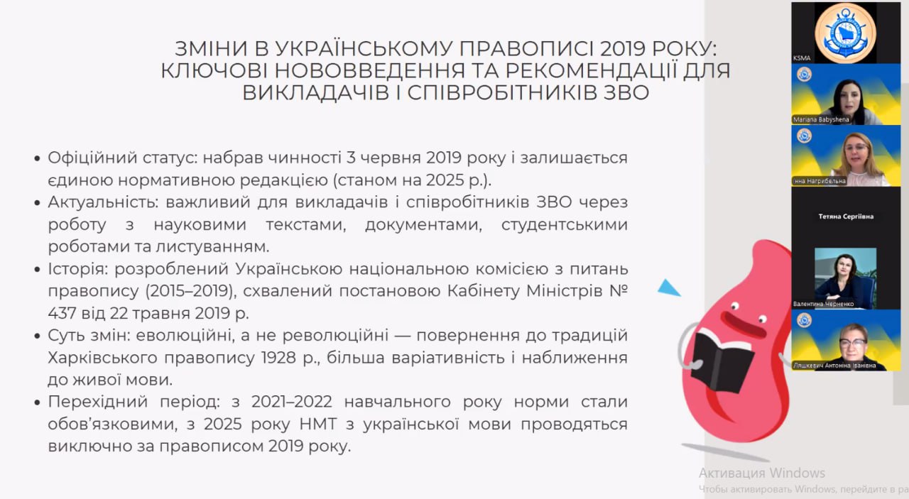 Рівень професіоналізму викладача сучасного закладу вищої освіти визначається потребою фахового удосконалення та оновлення знань. Освіта протягом життя та підвищення професійної компетентності – це складова професійного успіху. Саме тому в Херсонській державній морській академії реалізується низка заходів, що сприяє підвищенню рівня фахової компетентності. Одним із таких, що відбувся в ХДМА 5 грудня 2025 року, є семінар «Мовна грамотність працівників закладу вищої освіти як показник професійної культури» для науково-педагогічних, педагогічних працівників і співробітників академії.