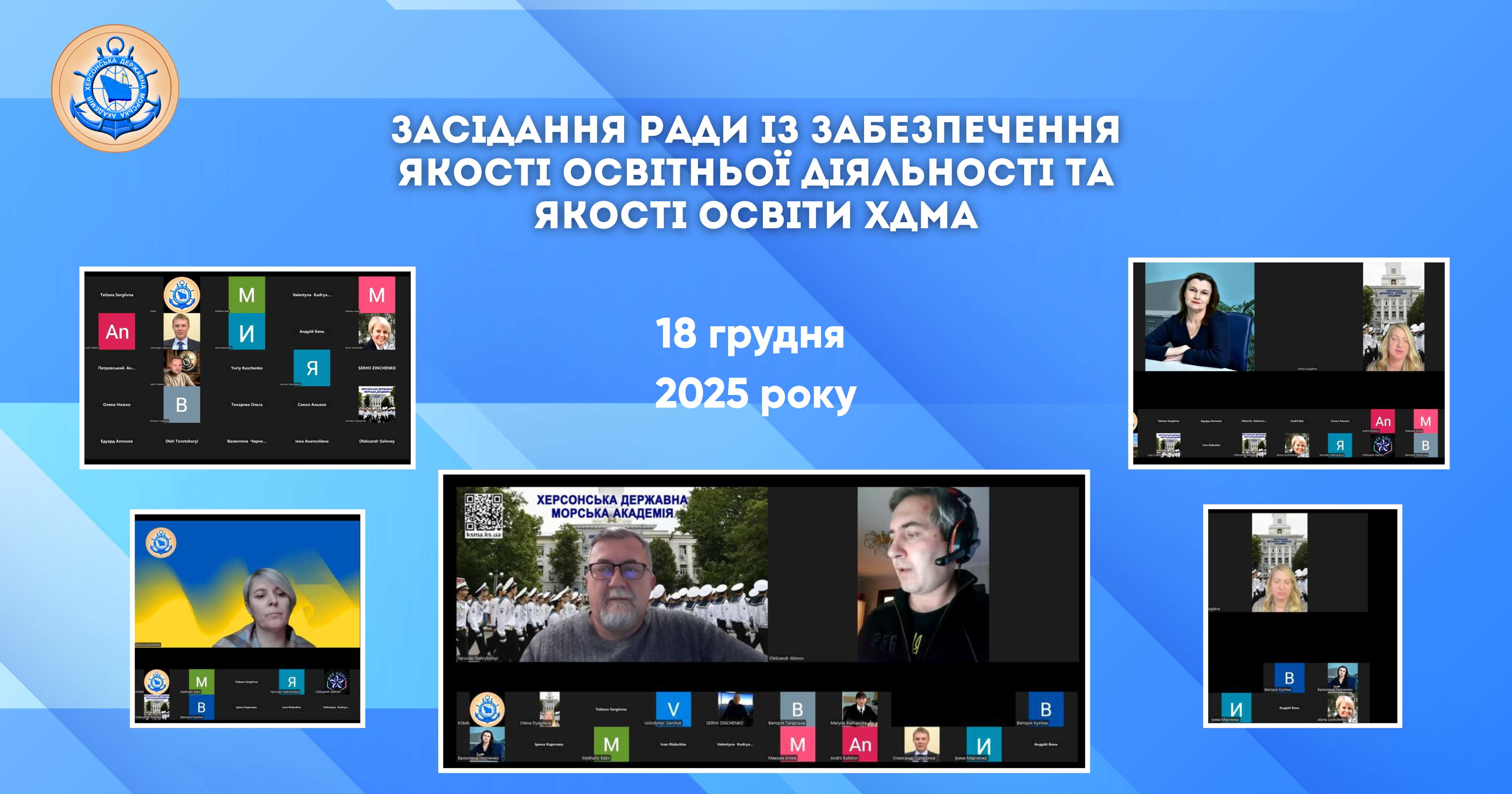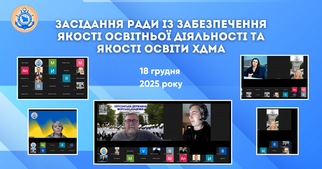 18 грудня 2025 року в Херсонській державній морській академії в онлайн-форматі відбулося чергове засідання ради із забезпечення якості освітньої діяльності та якості освіти академії, у роботі якого взяли участь члени Ради, представники структурних підрозділів та відповідальні за реалізацію політики у сфері забезпечення якості освіти.