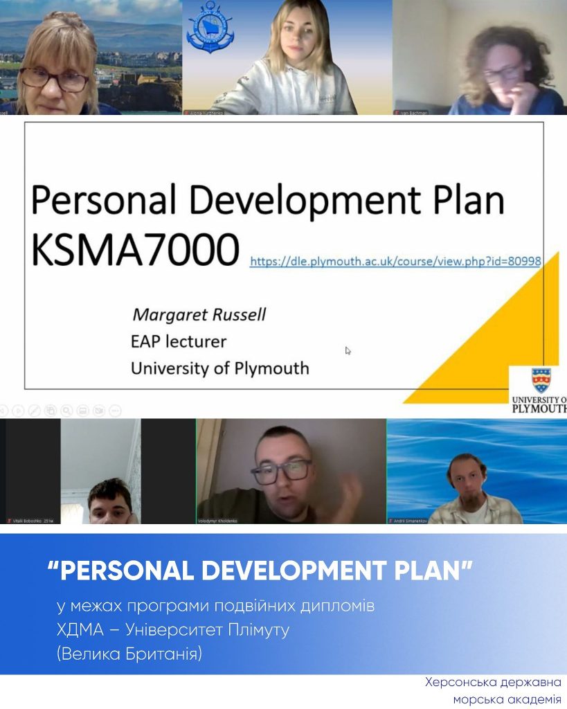 - 26 вересня 2023 року відбулася робоча онлайн-зустріч представників Університету Плімута (Великобританія) та Херсонської державної морської академії в рамках запровадження програми подвійних дипломів. Зустріч була присвячена обговоренню результатів складання вступного іспиту з англійської мови та перебігу вступної кампанії до участі у програмі. Крім того, керівництво проєкту розглядало питання надання допоміжних методичних матеріалів та забезпечення навчального процесу. Спираючись на перебіг вступного процесу, учасники заходу дійшли висновку, що проєкт має попит серед спеціалістів морської індустрії, серед яких діючі суднові механіки.