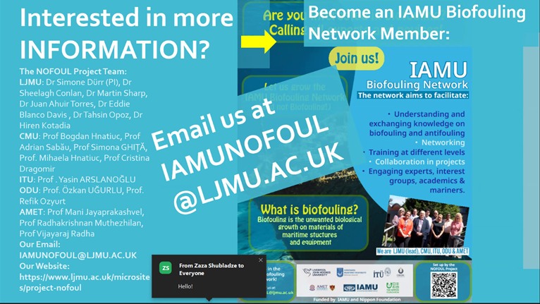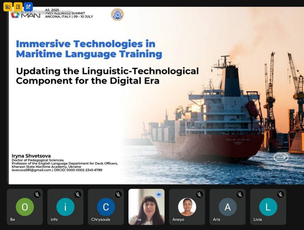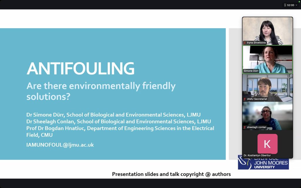 25 квітня 2025 року відбувся вебінар IAMU Biofouling Network – Environmentally friendly antifouling solutions, у якому взяли участь доктор педагогічних наук, професор кафедри англійської мови в судноводінні Херсонської державної морської академії Ірина ШВЕЦОВА і кандидат педагогічних наук, доцент кафедри англійської мови в судновій енергетиці Херсонської державної морської академії Олександра ЛІТІКОВА.Питання розробки екологічно чистих засобів боротьби з біообростанням є надзвичайно актуальним і викликає значний інтерес у наукової спільноти. Творча, інтерактивна атмосфера заходу сприяла активному обміну ідеями між учасниками та доповідачами.