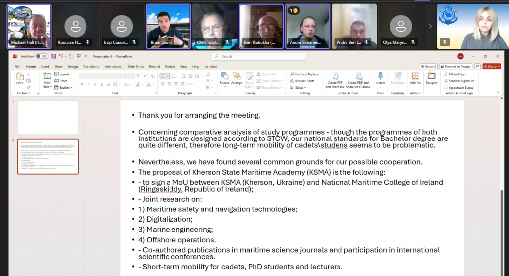 9 січня 2026 року, відбулася перша в цьому році робоча зустріч Херсонської державної морської академії з представниками Національного морського коледжу Ірландії (м. Ringaskiddy, Республіка Ірландія). Зустріч модерував Michael Hall — старший викладач та координатор з питань партнерства INGENIUM Технологічного університету Мюнстер. Під час обговорення сторони окреслили можливі формати співпраці та зосередилися на перспективах організації академічних обмінів між закладами.