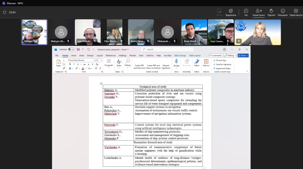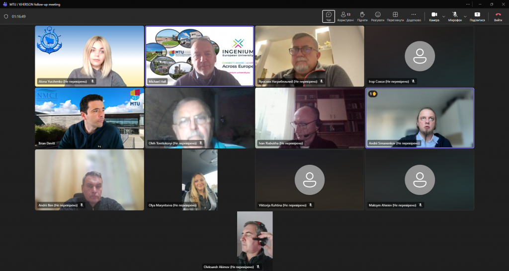 7 листопада 2025 року відбулася друга робоча зустріч Херсонської державної морської академії з представниками Національного морського коледжу Ірландії (м. Ringaskiddy, Республіка Ірландія). Зустріч модерував Michael Hall, старший викладач та координатор з питань партнерства INGENIUM Технологічного університету Мюнстер. Під час обговорення сторони зосередилися на перспективах співпраці — зокрема, короткострокових академічних мобільностях здобувачів вищої освіти, а також проведенні спільних наукових досліджень.