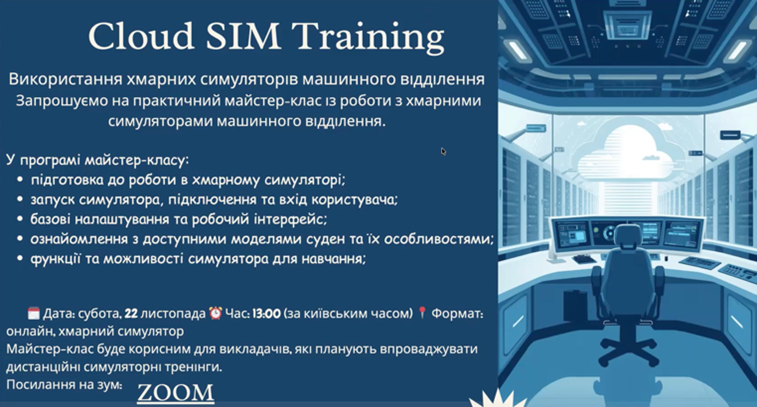 - Майстер-клас З використання хмарних симуляторів машинного відділення, 22 листопада 2025, Головний спікер: д.ф., доцент кафедри експлуатації суднового електрообладнання та засобів автоматики Артем Іванов;