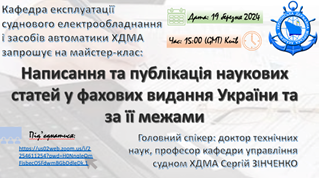 - Майстер-клас Написання та публікація наукових статей у фахових виданнях України та за її межами, 19 березня 2024, Головний спікер: д.т.н., доцент, професор кафедри управління судном ХДМА Сергій Зінченко;
