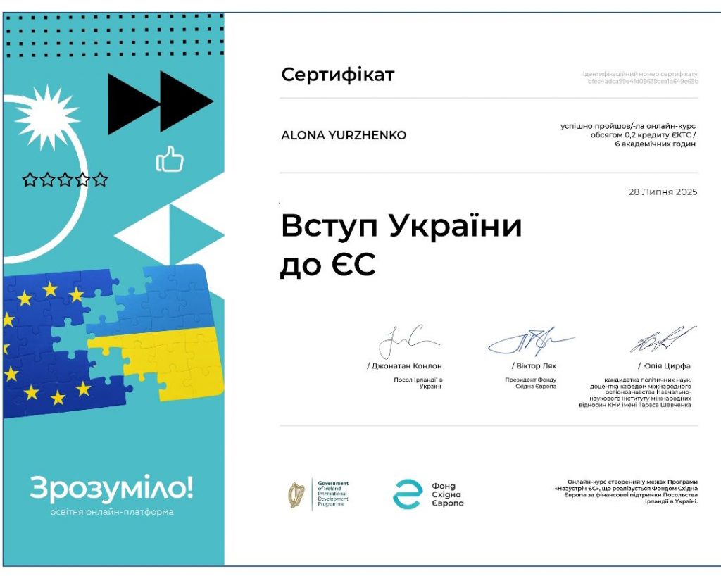 - 28го липня 2025 року начальниця відділу міжнародних зв’язків Херсонської державної морської академії Альона Юрженко успішно пройшла онлайн курс “Вступ України до ЄС” освітньої онлайн-платформи Зрозуміло.