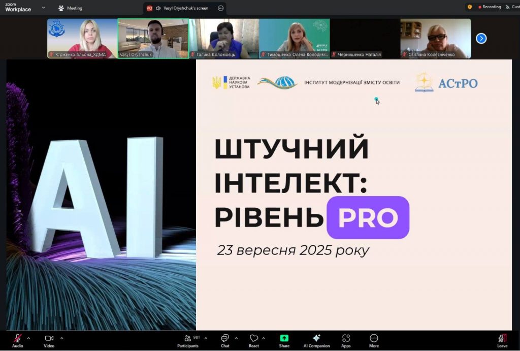 - Протягом 23-24 вересня 2025 року співробітники відділу ХДМА прийняли участь у Всеукраїнському практичному онлайн-курсів “Штучний інтелект в освіті: рівень PRO”. Курс поєднав у собі сучасні теоретичні знання та практичні завдання з використання штучного інтелекту в освіті. Спікерами виступили провідні експерти з цифровізації, штучного інтелекту та освітніх технологій, науковці, викладачі та практики, які впроваджують AI у навчальний процес. Дякуємо організаторам: Державній науковій установі «Інститут модернізації змісту освіти» Міністерства освіти і науки України; Освітній платформі «4PEOPLE»; ГО «Агенція сталого розвитку та освітніх ініціатив».