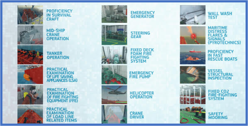 Практика проходження подібних курсів веде до глибшого результату навчання, запам’ятовування послідовності дій під час виконання відповідальних суднових робіт та дій у разі надзвичайних ситуацій на судні на рівні м’язової пам’яті та розвиває навички командної роботи. Кількість VR-тренінгів на початок 2026 року складає 18 окремих курсів та постійно збільшується. Першокурсники проходять тренінги з огляду та перевірки рятувальних засобів, безпеки використання суднових піротехнічних засобів, операційної готовності рятувальних плавзасобів, залишення судна за допомогою рятувальних шлюпкок різних типів, тренінгів з пожежогасіння та ін.