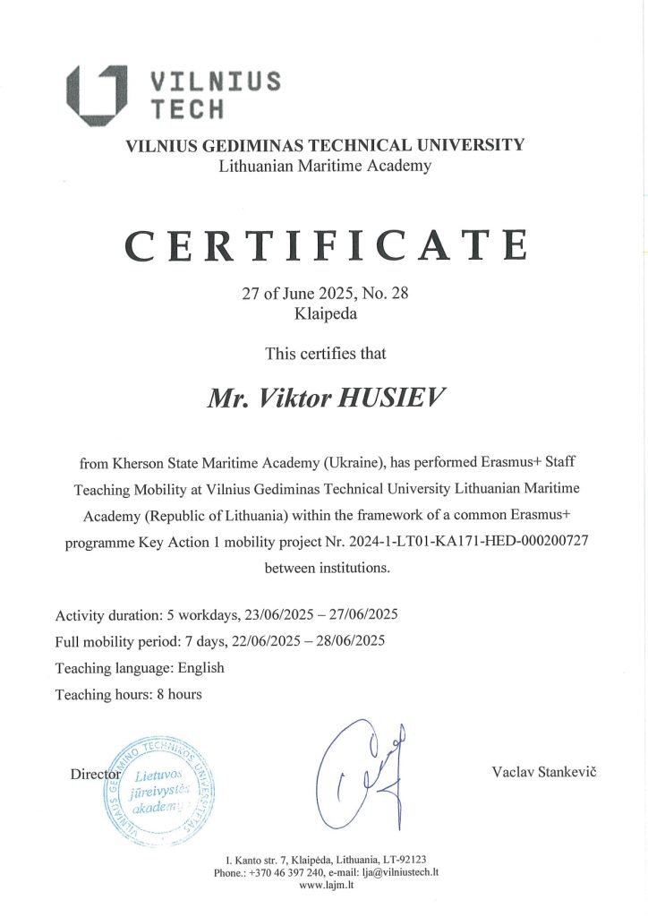 - Diploma awarding to students of Kherson State Maritime Academy at the Lithuanian Maritime Academy. The first diplomas were awarded to electrical engineers Nakoryk Denys and Tsement Andrii. Students obtained dual degrees of KSMA and LMA.